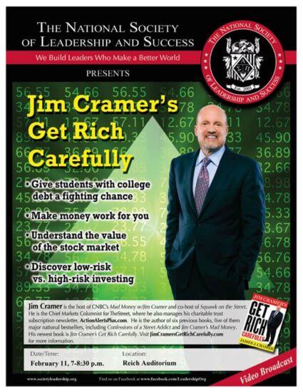 Jim Cramer, the host of CNBC’s “Mad Money” and co-host of “Squawk on the Street,” will be featured in a broadcast event sponsored by the A&M-Commerce chapter of The National Society of Leadership and Success. The event, entitled Get Rich…