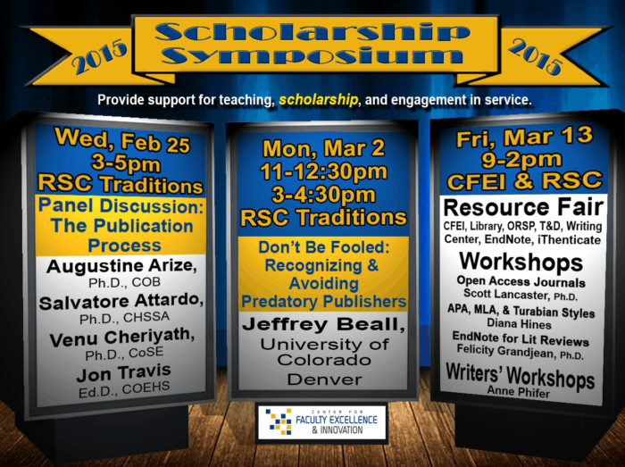 The Center for Faculty Excellence and Innovation (CFEI) will host a Scholarship Symposium during the spring semester. The symposium is a three-part event to support faculty with their scholarship endeavors, as well as give them a chance to learn scholarly…