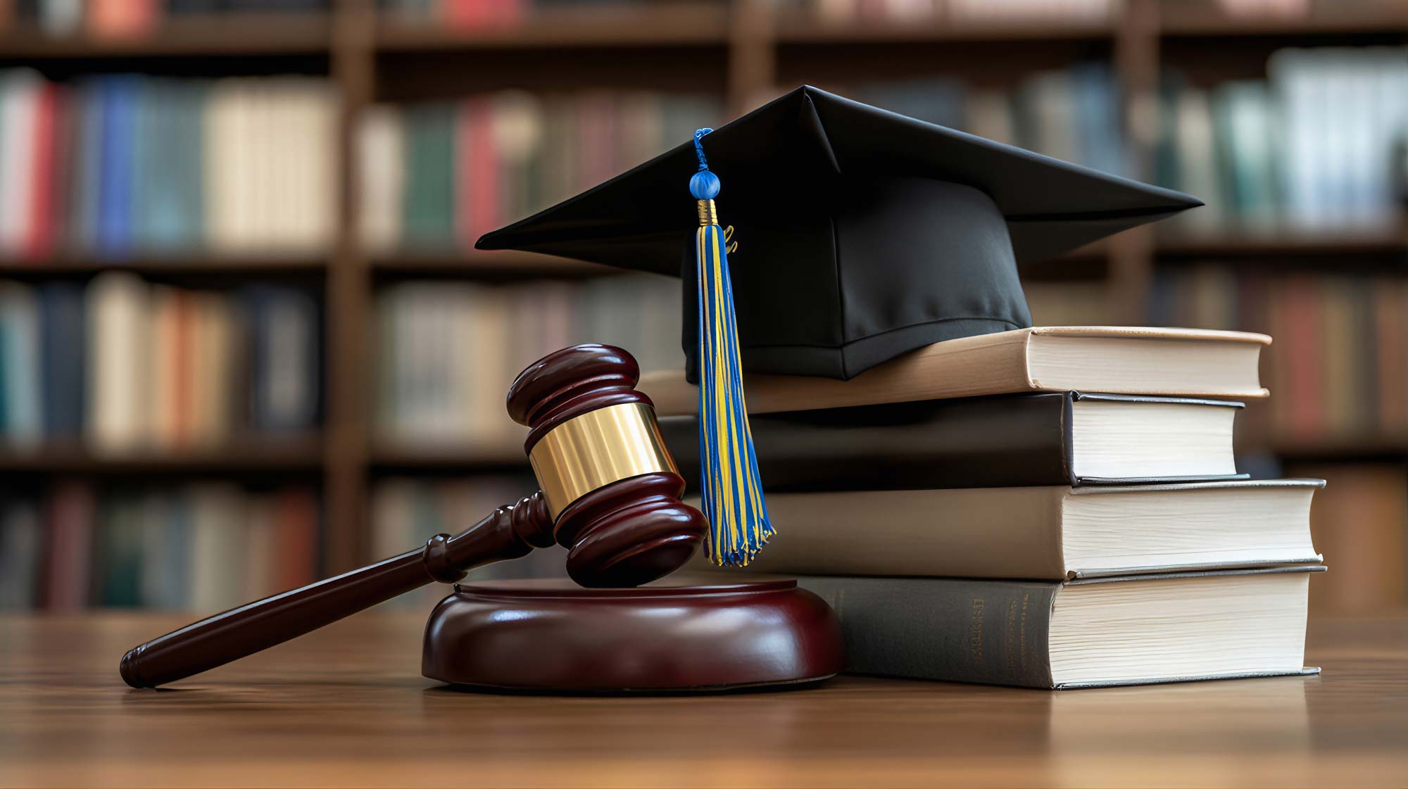 Female student studying notes. A gavel rests beside her on a table.